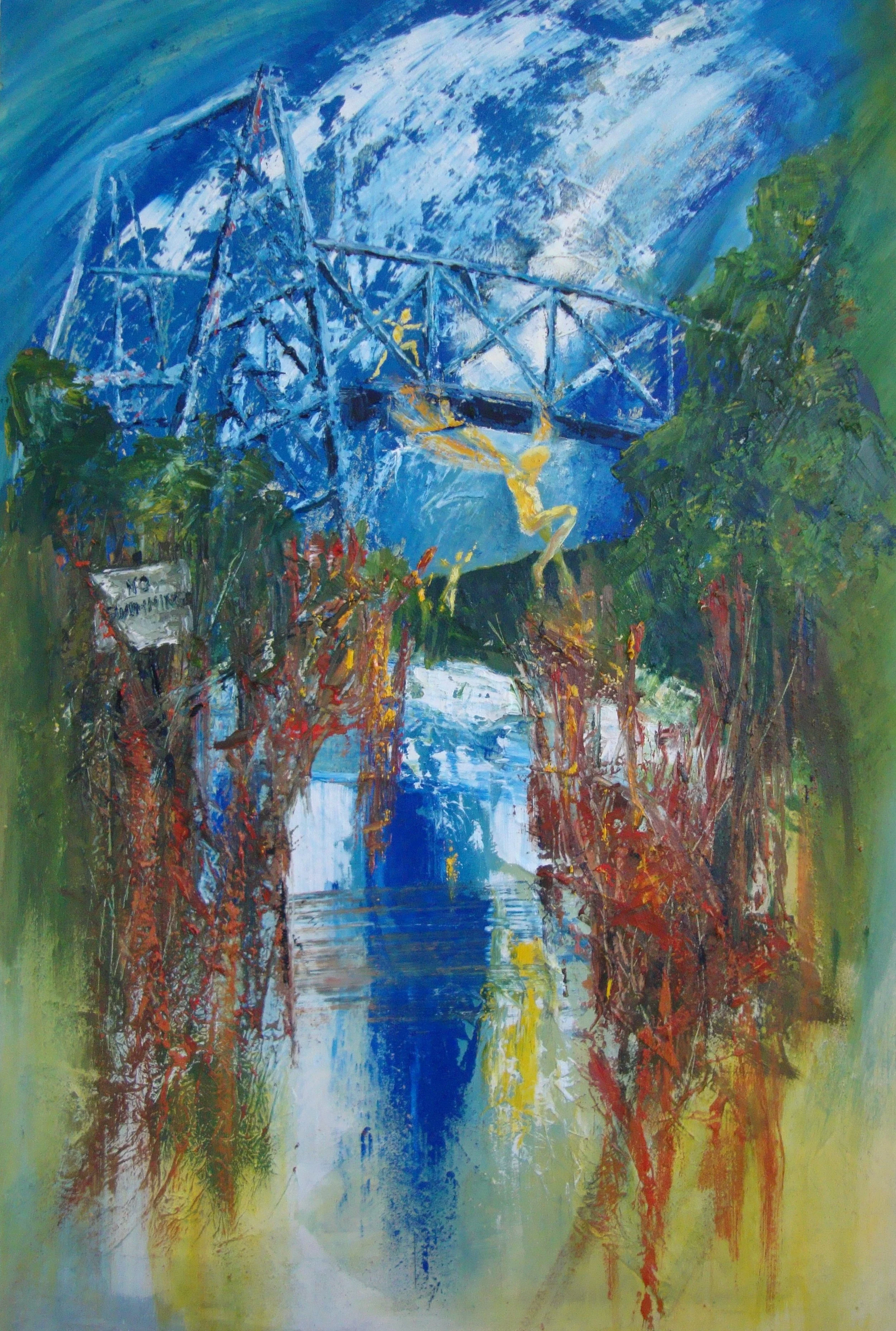 Another time, another place. The edgelands of a northern town. A murky river winds through the desolate post-industrial wasteland. At one point the river is spanned by a tall bridge of blue steel which once bore fat metal pipes carrying slurry from the nearby power station to be deposited in murky lagoons. Now the bridge is part of a footpath network. It is also an ideal structure to jump from.
