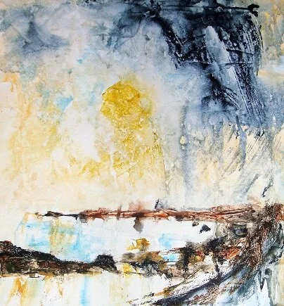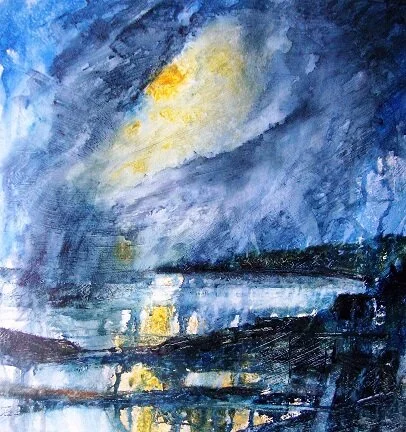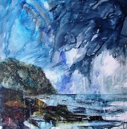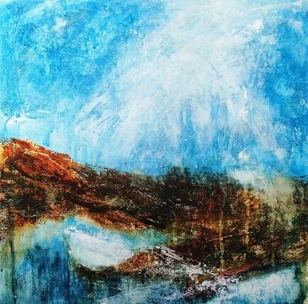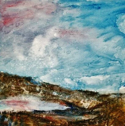 It was with these paintings that I began my experiments with gesso. Each picture is 36cm square. I wanted them to be square to give breathing space for the sky. I used rough watercolour paper, taped it down and and used a 2 inch household brush to apply a coat of gesso. This is a plaster-based medium often used as a ground for acrylic, indeed, sometimes mixed with it. I sloshed it on thickly to create a good texture.