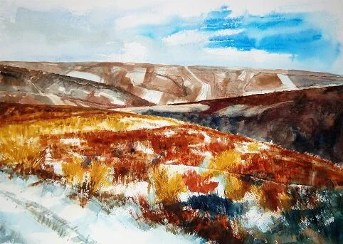 But I begin by dropping downhill to a little valley through which Faseny Water runs. I pass a farm cottage then a barn. Happily, a wooden footbridge gets me over the stream to the track beyond. Once on the gradual ascent I feel the crisp snow under my boots and begin to breathe huge lungfuls of pure, cold air, the elation of walking in the wide open spaces. Before me the snow clothed hillside, above me a winter sky of shifting harebell blue and thin veils of light cloud.