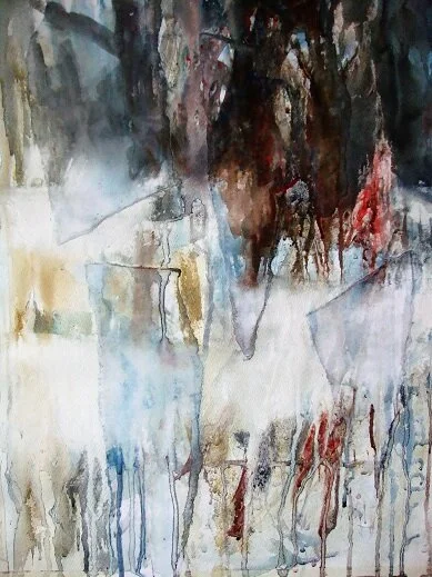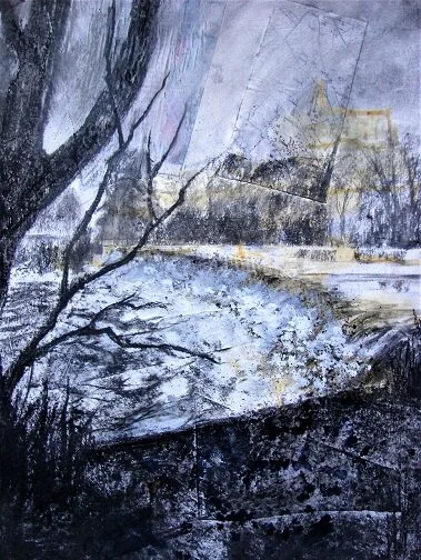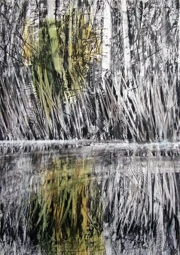 Then came a series of more abstract paintings, again using scraps of paper collage but this time applying wet watercolour, allowing it to run and mix, sinking into the torn edges. Then I worked in suggestions of trees and vegetation, trying to show the shifting boundaries of light and substance which again embodied the shades of my own response.