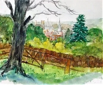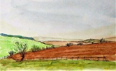 Once over the next field, freshly harrowed and spring ready, I climb over a wooden fence and find the way up through the gorse. The climb is steep but short. At the first ridge I stop and look down on the valley below.