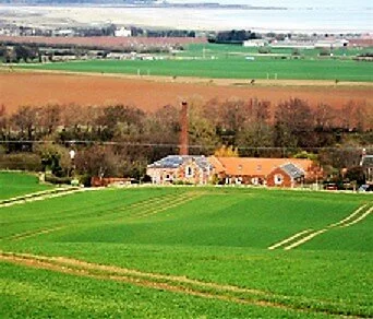 I leave the spires of Spott House behind and start back around the foot of Doon Hill’s steep northern side, wooded and blanketed in gorse beginning to blaze yellow. I look up and see the pale sun gleaming through the trees. Across the fields below is what used to be a farm but is now a cluster of privately owned cottages. There remains, though, a tall chimney. There are several such around the farmsteads of the Lothians. I recently found out that they are the survivors of steam threshing machines which were powered by coal from the rich seams to the west, towards Edinburgh.