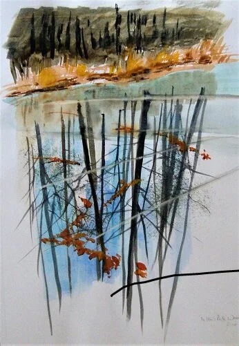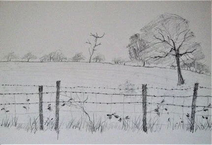 I am walking through a wood. There is a small marshy spot which after rain fills up to make a shallow pool. I stop here and observe the reflection of the trees and the floating twigs and leaves. I stand for a while enjoying the moment, a little pool of time. Beyond the pool the path skirts the edge of the wood. A wire fence and then a field with a tree or two. What is it about this ordinary view that makes me stop and want to draw it? Maybe its emptiness.