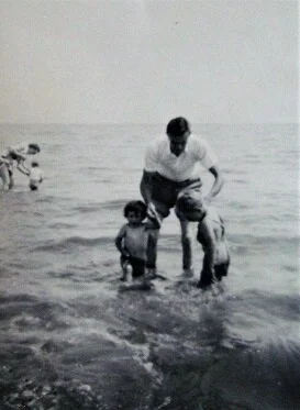 A wrinkled photograph shows my father in his shirt sleeves, trousers rolled above his knees, gingerly holding onto my sister and I in the shallow tide at…well, where? Bognor perhaps, or Littlehampton, where I puzzled over the way the sand was patterned in crinkly ridges, ‘the ribb’d Sea-sand’ of Coleridge’s Ancient Mariner.