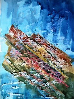 The strata of old red sandstone, 400 million years old, on which our houses and roads stand, out of which the substantial villas nearby are built, shelve out from the beach, red-umber slabs to be eroded and chipped away by the next millennium of wind and tide. I do a few exploratory watercolour sketches….