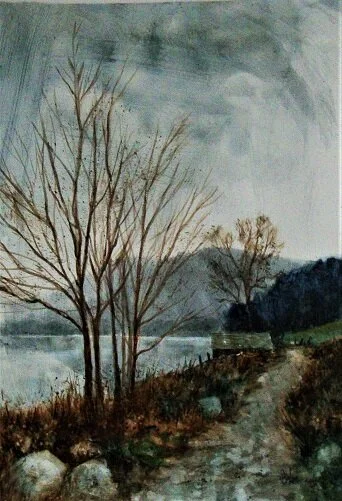 I am walking along the shore of the slate-grey lake southwards, the snowy ridge of Heron Pike and Great Rigg over to the west and the modest heights of Loughrigg before me. I pass the boathouse, one of my favourite things to sketch…..later I do a watercolour painting.