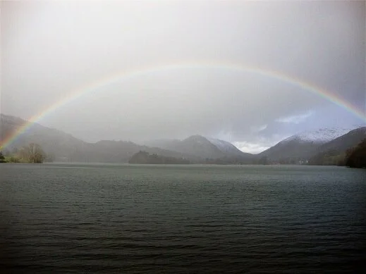 As I approach the southern end of the lake, the brightness gives way to a sudden shower. I stand on the shore and watch the swathe of rain sweep across the water….and behold a rainbow wonderfully, perfectly, spanning the lake.