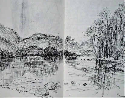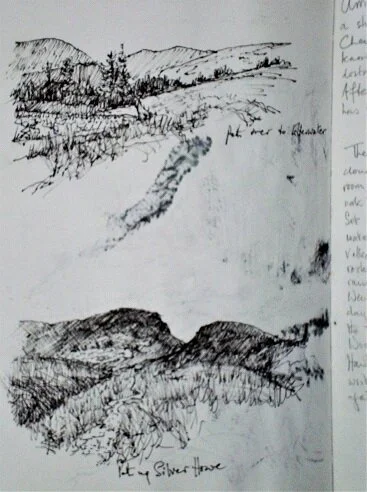 Here are some little watercolour sketches from that ‘midsummer February’. Looking up towards Silver How; tree in a rock; Far Easedale Ghyll; Brimmer Head Farm.