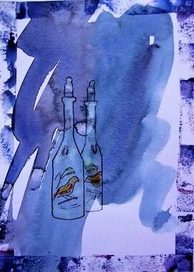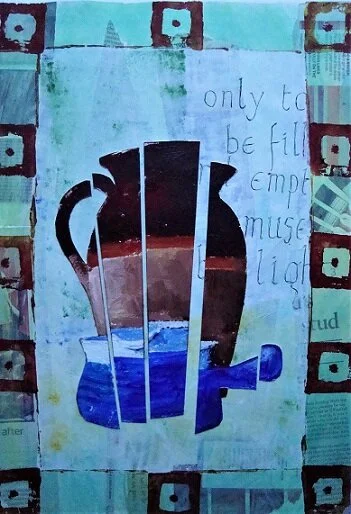 As a rule I am not much given to ornaments, but I have acquired a random collection of pots, vases and jars over the years which live — it is their home as well, I suppose — on the tops of my bookcases and cd racks. I have no idea how some of them came into my possession. That cowbell, for example, that clonks with echoes of Alpine valleys (and Mahler symphonies) and the wooden duck that peers down over ‘Much Ado About Nothing’…. where did I get them? But I now press-gang some of these items for a series of pictures and poems which I call ‘Collects’.