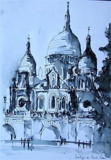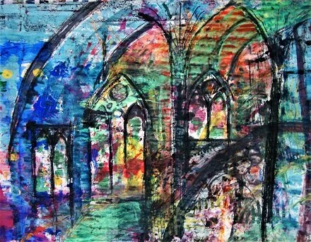Yet churches have somehow within their fabric a power to move and inspire. We are drawn to them as by a forcefield somewhere deep in the communal psyche, somewhere that sups from a cauldron of primitive fear and superstition and need. When I retired from full-time teaching I spent one of the best years of my life doing a Diploma in Art and Design at Wakefield College. Apart from the lovely Dilys, I was the only mature student — all the others were young 18 or 19 year-olds hoping to go on to University or Art College. I found it completely energising to spend a year in their company, so full of life and fresh ideas were they. Part of the course involved a winter visit to Paris, where we explored art galleries, museums, the catacombs and much else as well as enjoying the excellent bars and restaurants of the district. I remember sitting with Dilys at a pavement cafe while sparrows ate cake-crumbs from my hand. We also had to collect material for a project to be completed back in Wakefield. I based mine on Notre Dame Cathedral. On the last day of our visit I remember sitting down inside, letting the crowds of visitors drift by….’Dilys has gone her own way,’ I noted in my diary. ‘Here is that characteristic hush, the loud, echoing hush, nevertheless, of a busy cathedral…..the piped plainchant, the lavish crib, still up in February, complete with water feature….the solitary woman waiting by the confessional..’ And of course I drew the place, along with other stunning ecclesiastical edifices. I found the technique of drawing with a fountain pen then tinting it with clean water very handy.