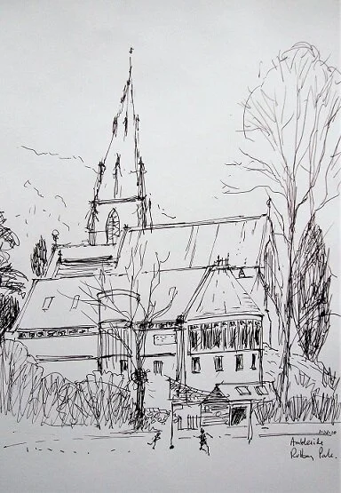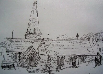 Another reason I like churches is that they are great to draw, and not only for the peculiarities of their architecture but for the settings they stand in. When I lived and worked in Yorkshire I was keen on running and one of the races I entered took to the roads and tracks of the wide, rolling landscape of the Yorkshire Wolds. About half way round we passed through the little village of Weaverthorpe on the edge of which was a church flanked by tall trees. After the race I drove back that way to stop and have a look. I entered through a lychgate. The narrow tower was very early with Saxon windows, and the building stood in what was effectively a flower meadow. I felt a strong sense of what can only be described as the spirit of the place.