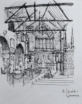 An hour’s drive would extract me from the city of Wakefield, manoeuvre me through the congestion of Leeds, release me onto the open roads past Otley and Ilkley and deliver me into the open arms of the Yorkshire Dales, Wharfedale the most accessible one. I would set off walking from Barden Bridge, or Grassington, Kettlewell or Buckden and spend the day up in the limestone hills. One of my favourite excursions was to branch off into Littondale, park at Arncliffe, climb up and over Old Cote Moor to Kettlewell, then back through Hawkswick and along the banks of the little River Skirfare to Arncliffe. But before I went home I always spent some time at the church, St. Oswald.s, wandering around the churchyard, popping inside if it happened to be open to look around, do a few sketches or just sit for a while.